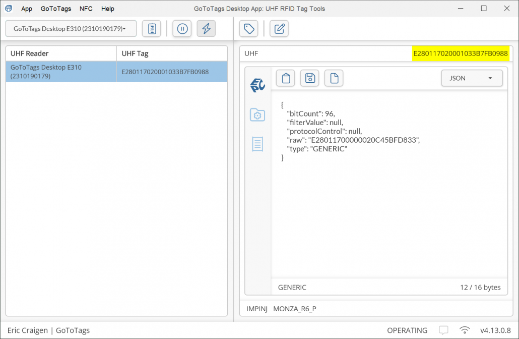 Example UHF RFID Tag Short TID: E2806995